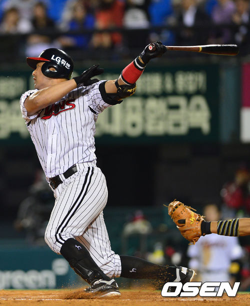 30일 오후 서울 잠실야구장에서 '2013 한국야쿠르트 세븐 프로야구' LG 트윈스 대 한화 이글스의 경기가 열렸다. 8회말 LG 공격 2사 2, 3루 상황 8번 최경철이 역전 2타점 우전 적시타를 날리고 있다.
