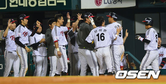 30일 오후 서울 잠실야구장에서 '2013 한국야쿠르트 세븐 프로야구' LG 트윈스 대 한화 이글스의 경기가 열렸다. 8회말 LG 공격 2사 2, 3루 상황 8번 최경철의 우전 안타 때 역전 득점에 성공한 이병규와 정주현이 더그아웃 동료들과 인사를 나누고 있다.