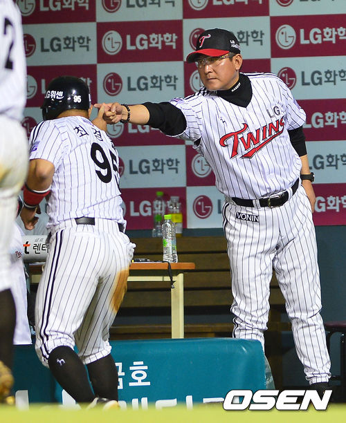 8회말 LG 공격 2사 2루 상황, 9번 이대형의 1타점 좌익수 키를 넘기는 2루타 때 득점에 성공한 최경철이 김기태 감독과 손가락 인사를 나누고 있다./dreamer@osen.co.kr
