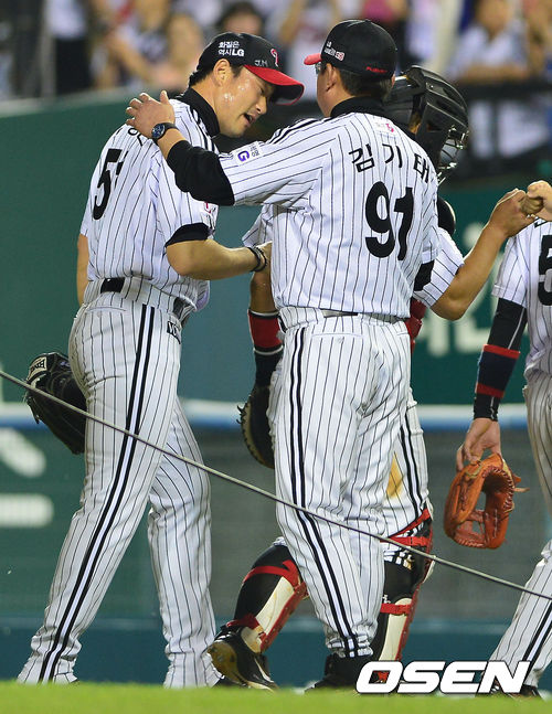 경기를 마무리지으며 세이브를 거둔 LG 봉중근이 김기태 감독과 인사를 나누고 있다./dreamer@osen.co.kr