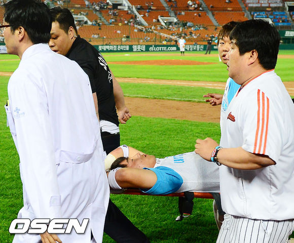 30일 오후 부산 사직구장에서 열린 2013 한국야쿠르트 세븐프로야구 롯데 자이언츠와 두산 베어스의 경기에서 9회초 선두타자 두산 홍성흔의 타구를 잡다가 쓰러진 롯데 2루수 정훈이 들것에 실려가고 있다.