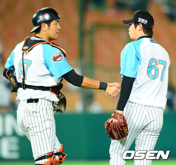 경기를 마치고 롯데 강민호와 김성배가 악수를 나누고 있다. / rumi@osen.co.kr