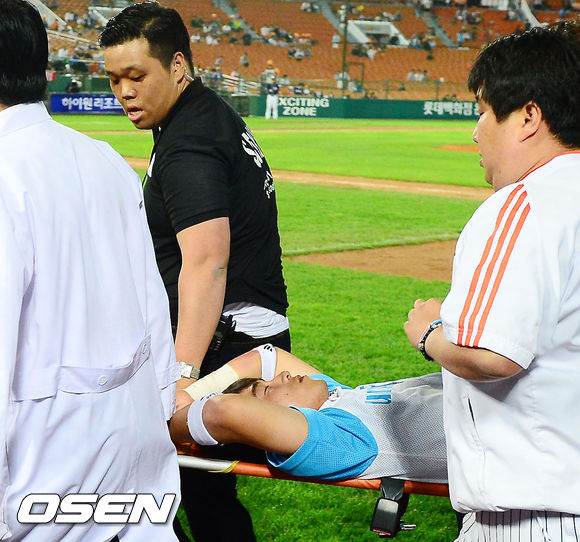 9회초 선두타자 두산 홍성흔의 타구를 잡다가 쓰러진 롯데 2루수 정훈이 들것에 실려가고 있다. / rumi@osen.co.kr