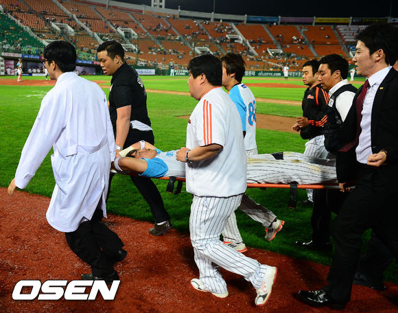 9회초 선두타자 두산 홍성흔의 타구를 잡다가 부상을 당한 롯데 2루수 정훈이 들것에 실려가고 있다. / rumi@osen.co.kr