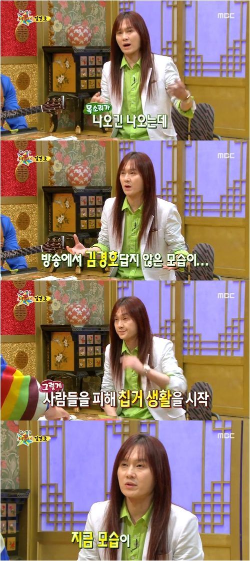 김경호는 “당시 집에 있는 모니터를 다 깨버렸다”면서 “대인기피증과 술에 의존하는 알코올의존증을 앓았다. 살도 이유 없이 쪘다. 지금은 60kg 정도 되는데 그때는 69kg까지 쪘다”고 힘들었다고 고백했다.
