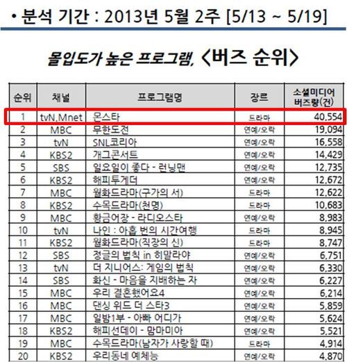 tvN-엠넷 뮤직드라마 '몬스타'가 방송 첫주부터 소셜미디어 버즈량에서 '무한도전', '런닝맨' 등 인기 예능프로그램을 제치고 1위를 차지했다.