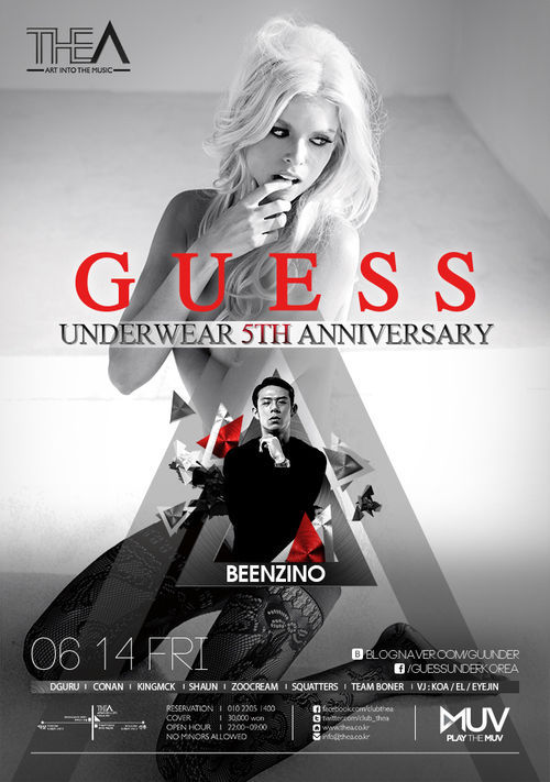 게스 언더웨어(GUESS Underwear)가 훈남 랩퍼 빈지노와 함께 흥겨운 게스 언더웨어 5주년 기념 파티를 연다. 게스 언더웨어는 6월 14일 서울 역삼동 클럽 디 에이(The A)에서 5주년 기념파티와 프로모션을 함께 진행한다고 31일 밝혔다.
