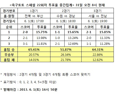 [축구토토] 국민체육진흥공단(www.kspo.or.kr)이 발행하는 체육진흥투표권 수탁사업자인 스포츠토토 공식 온라인 발매 사이트인 베트맨(www.betman.co.kr)은 내달 1일에 펼쳐지는 전북-부산(1경기), 수원-경남(2경기), 서울-전남(3경기)전 등 K리그 클래식 3경기를 대상으로 한 축구토토 스페셜 22회차 투표율 중간집계 결과, 축구팬 64.31%는 3경기 서울-전남전에서 서울이 완승을 거둘 것으로 전망했다고 밝혔다.