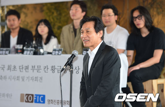 영화 '세이프(Safe)'로 제66회 칸 국제영화제 단편부문 최고상 수상의 쾌거를 안은 문병곤 감독과 주연배우인 강태영-이민지, 각본가 권오광이 31일 오전 서울 사당동 아트나인에서 기자회견을 가졌다. 안성기 신영균예술문화재단 이사장이 축사를 하고 있다.