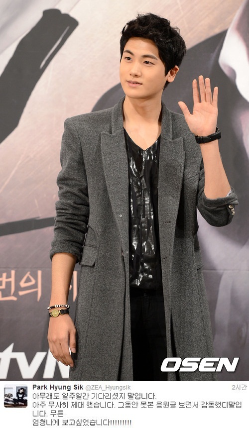박형식은 31일 오후 자신의 트위터에 "아무래도 일주일간 기다리셨지 말입니다. 아주 무사히 제대했습니다. 그동안 못 본 응원글 보면서 감동했지 말입니다. 무튼 엄청나게 보고 싶었습니다!"라는 글을 게재했다.