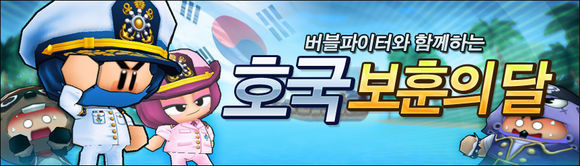 이번 이벤트는 6월 1일부터 30일까지 진행되며 ‘버블파이터’ 게임 내에서 국가보훈과 관련한 OX 퀴즈를 하루 5개 이상 맞히는 유저에게 ‘통일장 훈장’을, ‘BF 해군HC 의상’을 입고 ‘버블파이터’ 게임을 5판 이상 플레이하는 유저에게 ‘태극무공 훈장’을 하루 한 개씩 제공한다.