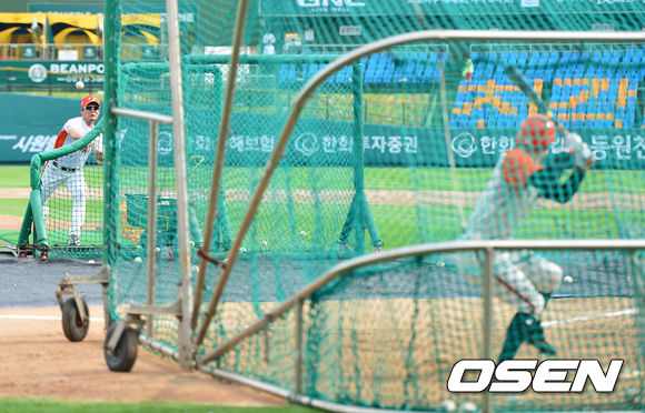 31일 오후 대전구장에서 열리는 '2013 한국야쿠르트 세븐 프로야구' 한화 이글스와 NC 다이노스의 경기를 앞두고 한화 이종범 주루코치가 배팅볼을 던지고 있다.