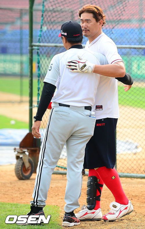 31일 오후 광주 무등구장에서 2013 한국야쿠르트 세븐프로야구 KIA 타이거즈와 LG 트윈스의 경기가 열릴 예정인 가운데 양팀 훈련 시간에 LG 최태원 코치와 KIA 최희섭이 포옹을 하고 있다.