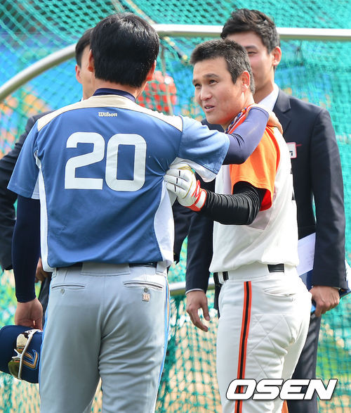 31일 오후 대전구장에서 열리는 '2013 한국야쿠르트 세븐 프로야구' 한화 이글스와 NC 다이노스의 경기를 앞두고 한화 이대수와 NC 이승호가 인사를 나누고 있다.
