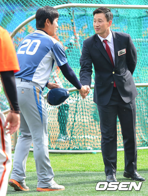 31일 오후 대전구장에서 열리는 '2013 한국야쿠르트 세븐 프로야구' 한화 이글스와 NC 다이노스의 경기를 앞두고 NC 이승호와 김재현 해설위원이 인사를 나누고 있다.