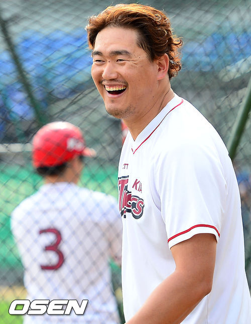 31일 오후 광주 무등구장에서 2013 한국야쿠르트 세븐프로야구 KIA 타이거즈와 LG 트윈스의 경기가 열릴 예정인 가운데 양팀 훈련 시간에 KIA 최희섭이 환하게 웃고 있다.