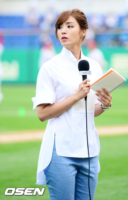 31일 오후 광주 무등구장에서 2013 한국야쿠르트 세븐프로야구 KIA 타이거즈와 LG 트윈스의 경기가 열릴 예정인 가운데 양팀 훈련 시간에 덕아웃 앞에서 KBS N 정인영 아나운서가 촬영을 준비하며 표정을 짓고 있다.