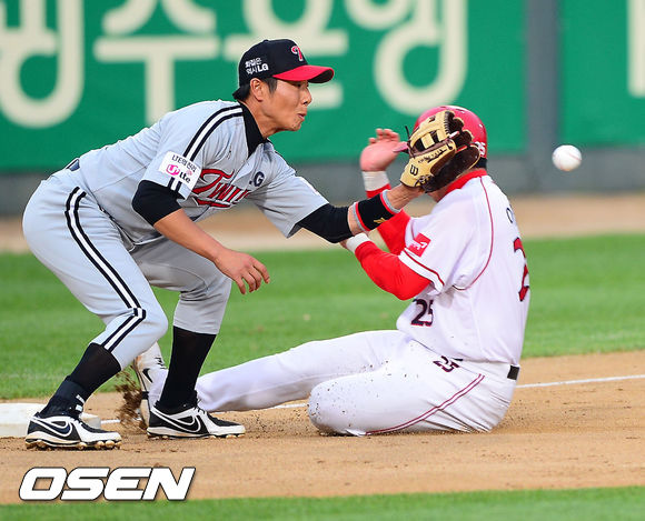 31일 오후 광주 무등구장에서 열린 2013 한국야쿠르트 세븐프로야구 KIA 타이거즈와 LG 트윈스의 경기,2회말 2사 주자 1루 KIA 차일목의 우익수 오른쪽 1루타때 이범호가 3루에 세이프되고 있다.