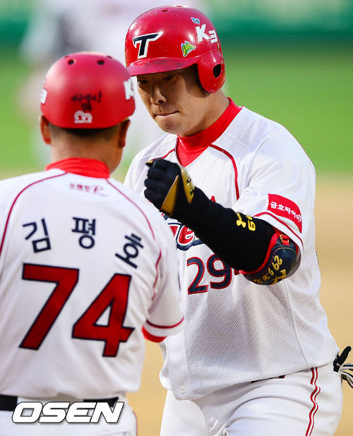 31일 오후 광주 무등구장에서 열린 2013 한국야쿠르트 세븐프로야구 KIA 타이거즈와 LG 트윈스의 경기,3회말 2사 주자 1,2루 KIA 나지완이 좌익수 앞 동점 1타점 적시타를 날린 후 1루에서 김평호 코치와 하이파이브를 하고 있다.