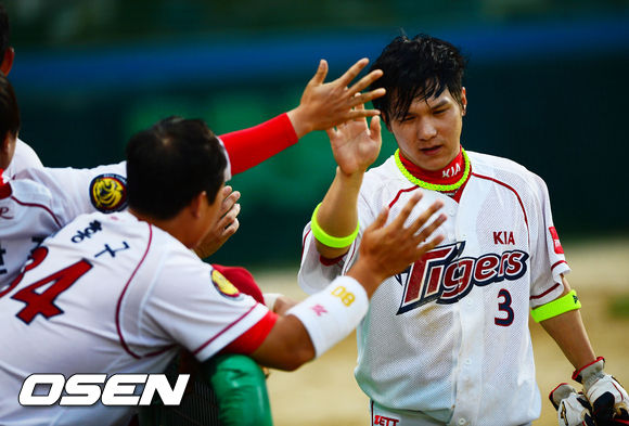 31일 오후 광주 무등구장에서 열린 2013 한국야쿠르트 세븐프로야구 KIA 타이거즈와 LG 트윈스의 경기,3회말 2사 주자 1,2루 KIA 나지완의 좌익수 앞 동점 1타점 적시타 때 홈을 밟은 김선빈이 덕아웃에서 동료들과 하이파이브를 하고 있다.