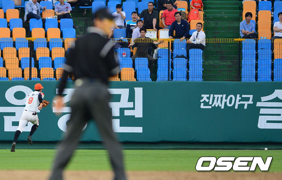 31일 오후 대전구장에서 '2013 한국야쿠르트 세븐 프로야구' 한화 이글스와 NC 다이노스의 경기가 열렸다. 4회초 NC 공격 2사 2루 상황, 5번 조영훈이 선제 1타점 좌전 적시타 때 공을 빠트리는 실책을 범한 한화 좌익수 추승우가 공을 잡기 위해 뛰어가고 있다.
