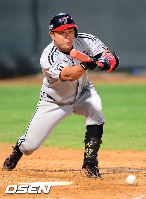 31일 오후 광주 무등구장에서 열린 2013 한국야쿠르트 세븐프로야구 KIA 타이거즈와 LG 트윈스의 경기, 5회초 무사 주자 2루 LG 최경철이 희생번트에 성공하고 있다.