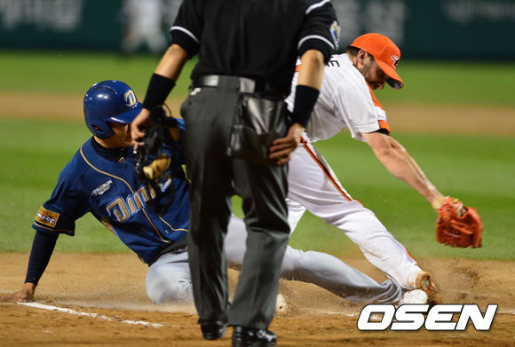 31일 오후 대전구장에서 '2013 한국야쿠르트 세븐 프로야구' 한화 이글스와 NC 다이노스의 경기가 열렸다. 6회초 NC 공격 2사 3루 8번 노진혁 타석 때, 한화선발 이브랜드의 폭투를 틈타 홈으로 쇄도한 3루 주자 조영훈이 세이프 되고 있다.