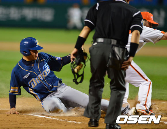 31일 오후 대전구장에서 '2013 한국야쿠르트 세븐 프로야구' 한화 이글스와 NC 다이노스의 경기가 열렸다. 6회초 NC 공격 2사 3루 8번 노진혁 타석 때, 한화선발 이브랜드의 폭투를 틈타 홈으로 쇄도한 3루 주자 조영훈이 세이프 되고 있다.