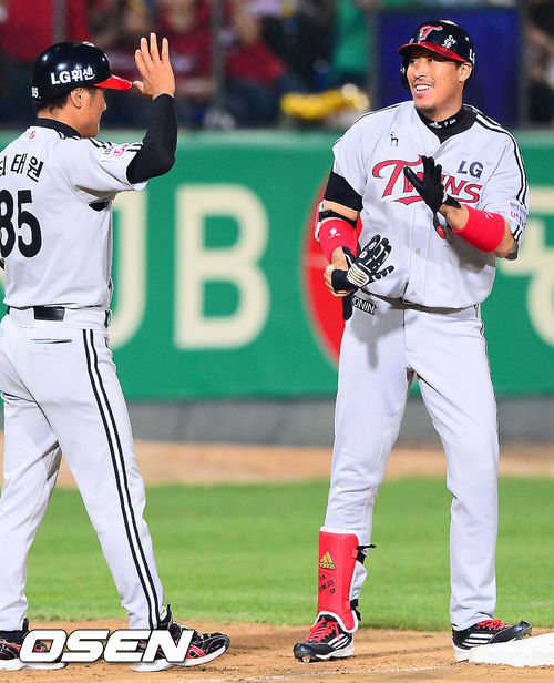 31일 오후 광주 무등구장에서 열린 2013 한국야쿠르트 세븐프로야구 KIA 타이거즈와 LG 트윈스의 경기, 6회초 2사 주자 1루 LG 이병규가 1타점 3루타를 날린 후 최태원 코치와 하이파이브를 하고 있다.