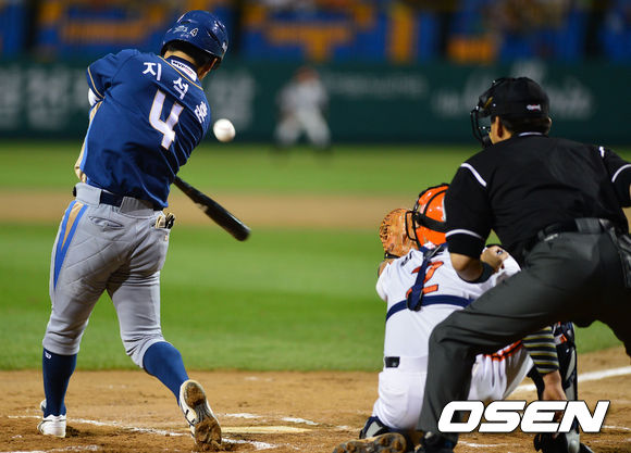31일 오후 대전구장에서 '2013 한국야쿠르트 세븐 프로야구' 한화 이글스와 NC 다이노스의 경기가 열렸다. 6회초 NC 공격 1사 2, 3루 상황 7번 지석훈이 1타점 우익수 희생플라이를 날리고 있다.