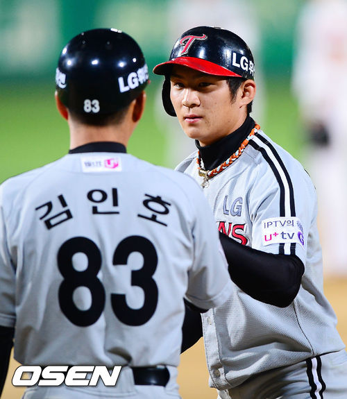 31일 오후 광주 무등구장에서 열린 2013 한국야쿠르트 세븐프로야구 KIA 타이거즈와 LG 트윈스의 경기, 7회초 무사 주자 1,3루 LG 오지환이 좌익수 앞 1타점 적시타를 날린 후 기뻐하고 있다.