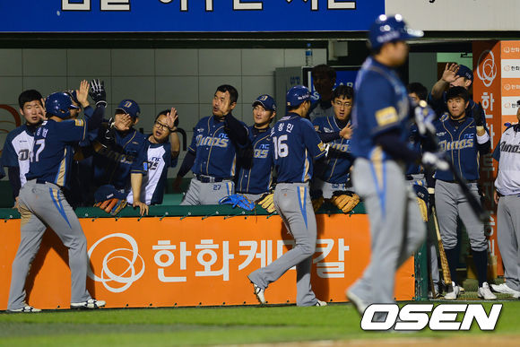 31일 오후 대전구장에서 '2013 한국야쿠르트 세븐 프로야구' 한화 이글스와 NC 다이노스의 경기가 열렸다. 7회초 NC 공격 2사 만루 상황, 5번 조영훈의 2타점 우전 적시타 때 득점에 성공한 나성범과 모창민이 더그아웃 동료들과 인사를 나누고 있다.