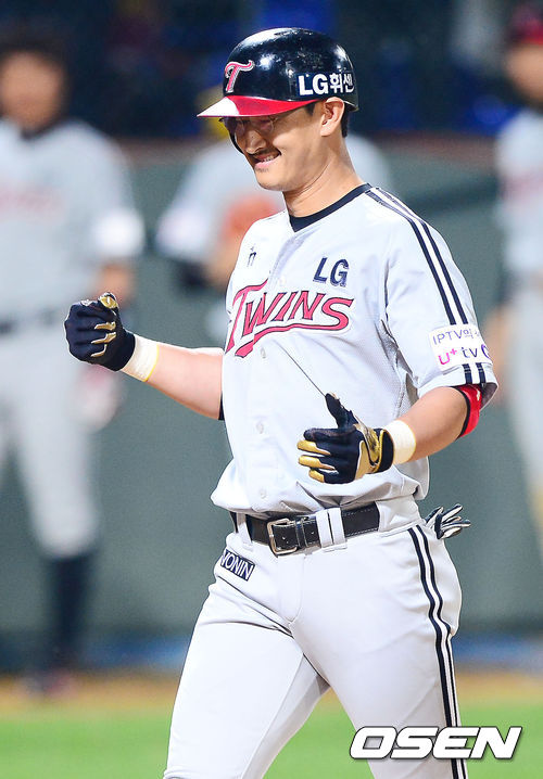 31일 오후 광주 무등구장에서 열린 2013 한국야쿠르트 세븐프로야구 KIA 타이거즈와 LG 트윈스의 경기, 7회초 무사 주자 만루 LG 박용택이 만루 홈런을 날린 후 홈을 밟으며 기뻐하고 있다.