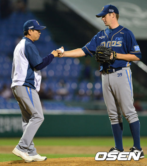 31일 오후 대전구장에서 '2013 한국야쿠르트 세븐 프로야구' 한화 이글스와 NC 다이노스의 경기가 열렸다. 7회말 한화 공격, 1사 주자없는 상황 NC 선발 찰리가 마운드를 내려가며 최일언 투수코치와 인사를 나누고 있다.
