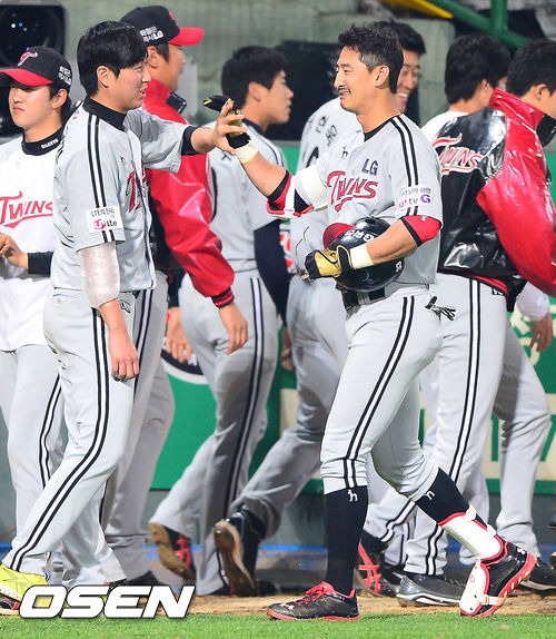 31일 오후 광주 무등구장에서 열린 2013 한국야쿠르트 세븐프로야구 KIA 타이거즈와 LG 트윈스의 경기, 7회초 무사 주자 만루 LG 박용택이 만루 홈런을 날린 후 덕아웃에서 동료들과 기쁨을 나누고 있다.