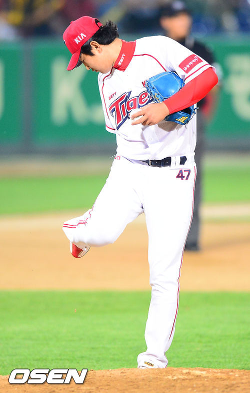31일 오후 광주 무등구장에서 열린 2013 한국야쿠르트 세븐프로야구 KIA 타이거즈와 LG 트윈스의 경기, 7회초 무사 주자 1,2루 LG 이대형의 3루수 앞 번트 타구때 볼을 잡으려던 박경태가 미끄러져 넘어진 후 마운드로 돌아와 자신의 스파이크를 살피고 있다.