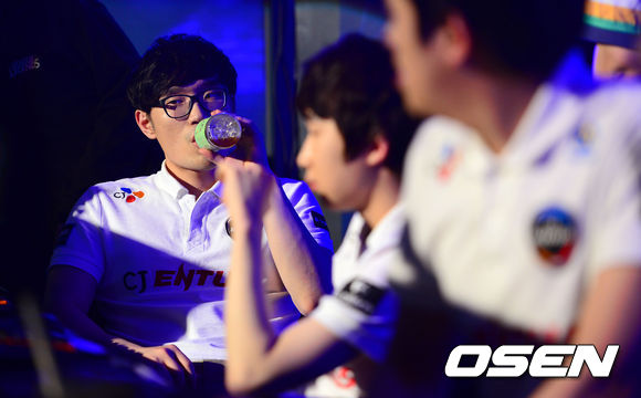 31일 오후 서울 용산 온게임넷 e스포츠상설경기장에서 열린 '올림푸스 LOL 챔피언스(롤챔스)' 스프링 2013시즌 4강전 CJ 엔투스 프로스트와 CJ 엔투스 블레이즈의 경기, 1-2세트 모두 패한 프로스트 이현우가 어두운 표정을 짓고 있다