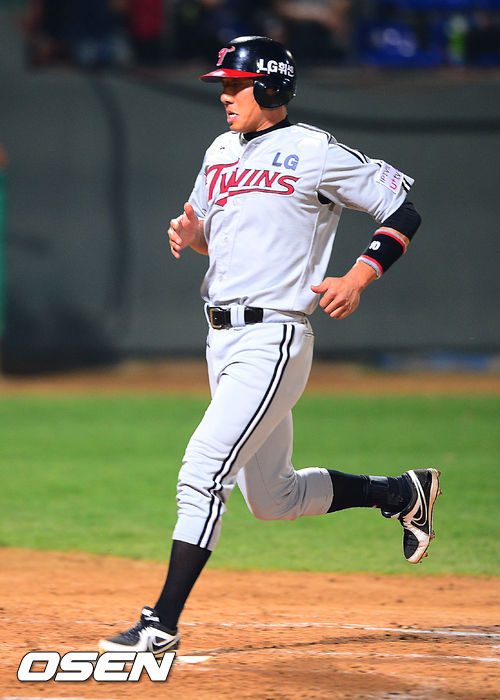 31일 오후 광주 무등구장에서 열린 2013 한국야쿠르트 세븐프로야구 KIA 타이거즈와 LG 트윈스의 경기, 7회초 1사 주자 3루 LG 최경철의 좌익수 희생플라이때 3루 주자 권용관이 홈을 밟고 있다.