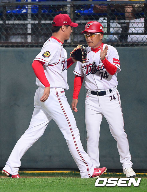 31일 오후 광주 무등구장에서 열린 2013 한국야쿠르트 세븐프로야구 KIA 타이거즈와 LG 트윈스의 경기, 9회초 KIA 중견수로 복귀한 김주찬이 9회를 마치고 덕아웃으로 들어오며 김평호 코치와 하이파이브를 하고 있다.