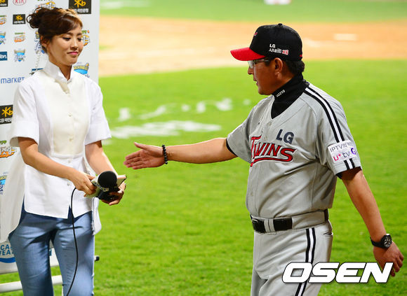경기를 마치고 승리 인터뷰를 위해 걸어나온 LG 김기태 감독이 KBSN 정인영 아나운서에게 악수를 건내고 있다. / rumi@osen.co.kr