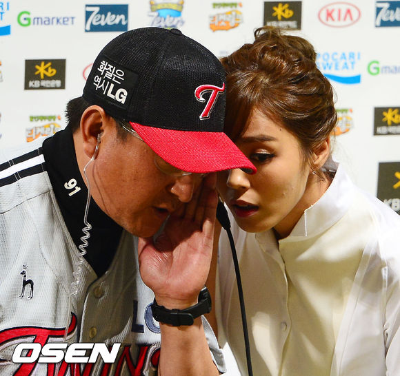 경기를 마치고 승리 인터뷰때 KBSN 정인영 아나운서와 LG 김기태 감독이 귓속말을 나누고 있다. / rumi@osen.co.kr
