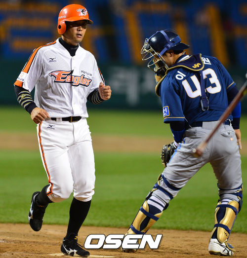 9회말 한화 공격 2사 2루 상황, 주자 강동우가 김경언의 적시타 때 홈을 밟으며 이날 팀의 첫 득점을 만들어내고 있다./dreamer@osen.co.kr