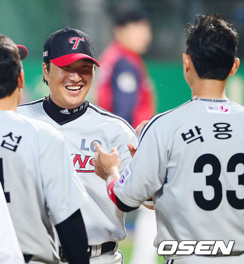 경기를 마치고 LG 이진영이 이 날 만루홈런을 날린 박용택과 하이파이브를 하고 있다. / rumi@osen.co.kr