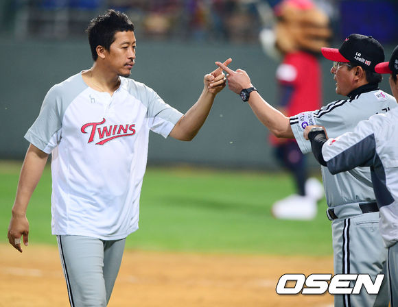 경기를 마치고 LG 이병규가 김기태 감독과 손가락 하이파이브를 하고 있다. / rumi@osen.co.kr