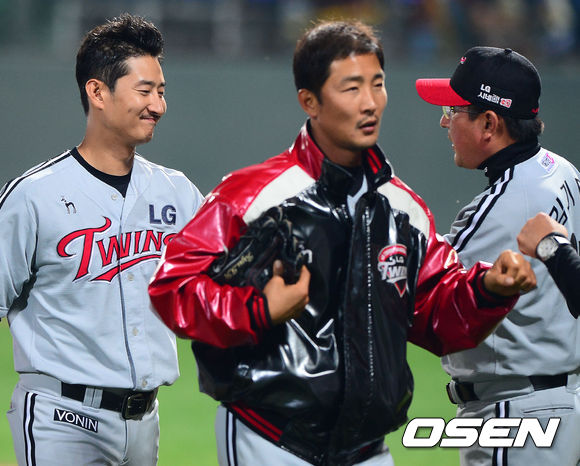 경기를 마치고 LG 박용택이 김기태 감독과 손가락 하이파이브를 하고 있다. / rumi@osen.co.kr
