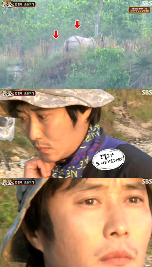다음날 새벽 6시 경에도 코뿔소가 포착됐다. 김병만은 코뿔소가 또 나타났다는 말에 표정이 굳어졌다.
