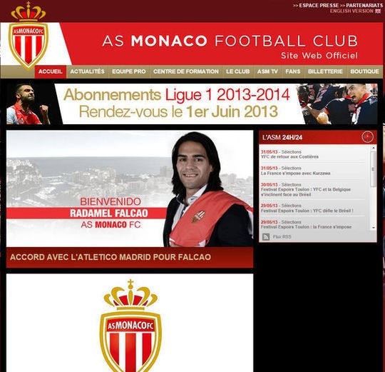 모나코는 1일(이하 한국시간) 공식 홈페이지를 통해 "아틀레티코(AT) 마드리드의 팔카오와 계약을 체결, 그가 다음 시즌부터 모나코에서 뛴다"라고 전했다. 계약 기간은 5년이다.