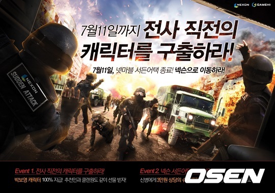 오는 7월 11일 넥슨 단독 서비스 시작을 앞두고 진행되는 이번 캠페인은 ‘전사 직전의 캐릭터를 구출하라!’라는 테마로 넷마블 서든어택 캐릭터를 보유한 유저와 넥슨 서든어택에 새롭게 가입하는 유저를 대상으로 대대적으로 진행된다.