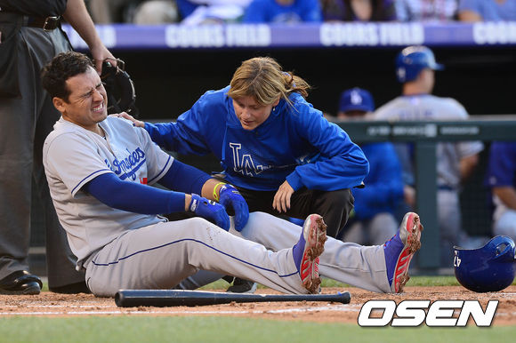 1일 오전(이하 한국시간) 미국 콜로라도주 덴버 쿠어스 필드에서 열린 콜로라도 로키스와 LA 다저스의 경기 3회초 선두타자 크루스가 갈랜들의 투구에 손을 맞고 고통스러워 하고 있다.
