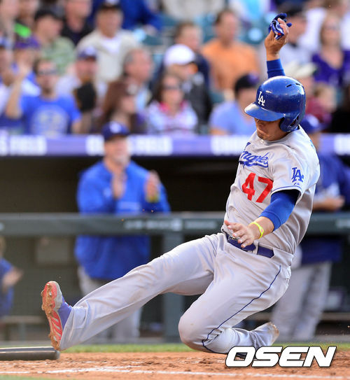 1일 오전(이하 한국시간) 미국 콜로라도주 덴버 쿠어스 필드에서 열린 콜로라도 로키스와 LA 다저스의 경기 3회초 무사 1루 우리베의 1타점 2루타에 크루스가 득점하고 있다.